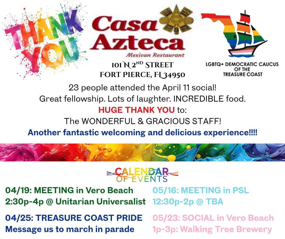 23 people attended the April 11th social! There was great fellowship, laughter, and incredible food! Thank you to the wonderful staff at Casa for hosting host! See you all in Vero at next month’s social on 05/23